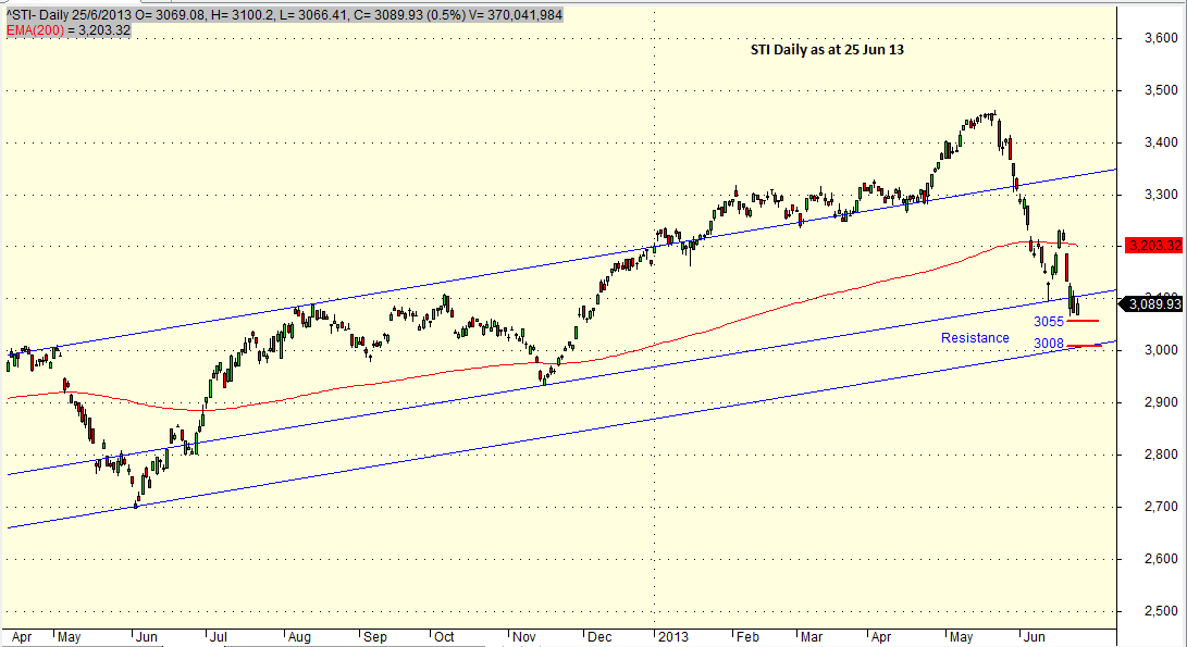 Last Friday 14 Jun 13, the STI went back to above its support of 3140 to 3150. The previous day was a false broke down.