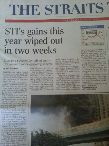 21 Jun – DJ -350 pts. Support was breached. STI gap down. I closed all my position. It really a pity that the market rebound was totally crushed by Bernanke’s talk.