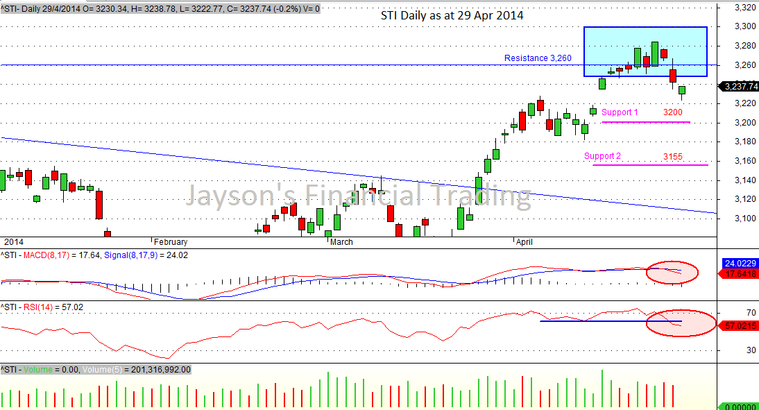 As at 29 Apr 2014, the STI closed at 3,237 with RSI making a failure swing and MSCD crossing down below the signal line. The next support is at 3,200. Let’s see how the index react at 3,200. When it gets supported and the indicators are wearing off, signifying supported retracement, look for a high probability setup for entry.