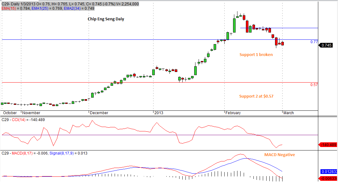 Sometimes I wonder how come bad news coincide with technical reversal. Today STI actually gap down and broke its short term support. I am looking at next support at 3,160-3,170. For those who haven’t seen my earlier posting, please take a look at the posting of STI 22 Feb 13 (weekly/ daily) on my analysis of STI in near term. Let’s wait to see if STI gets supported at 3,160 – 3,170. I would also expect evening star candlestick pattern to form at the end of the week in the weekly chart.